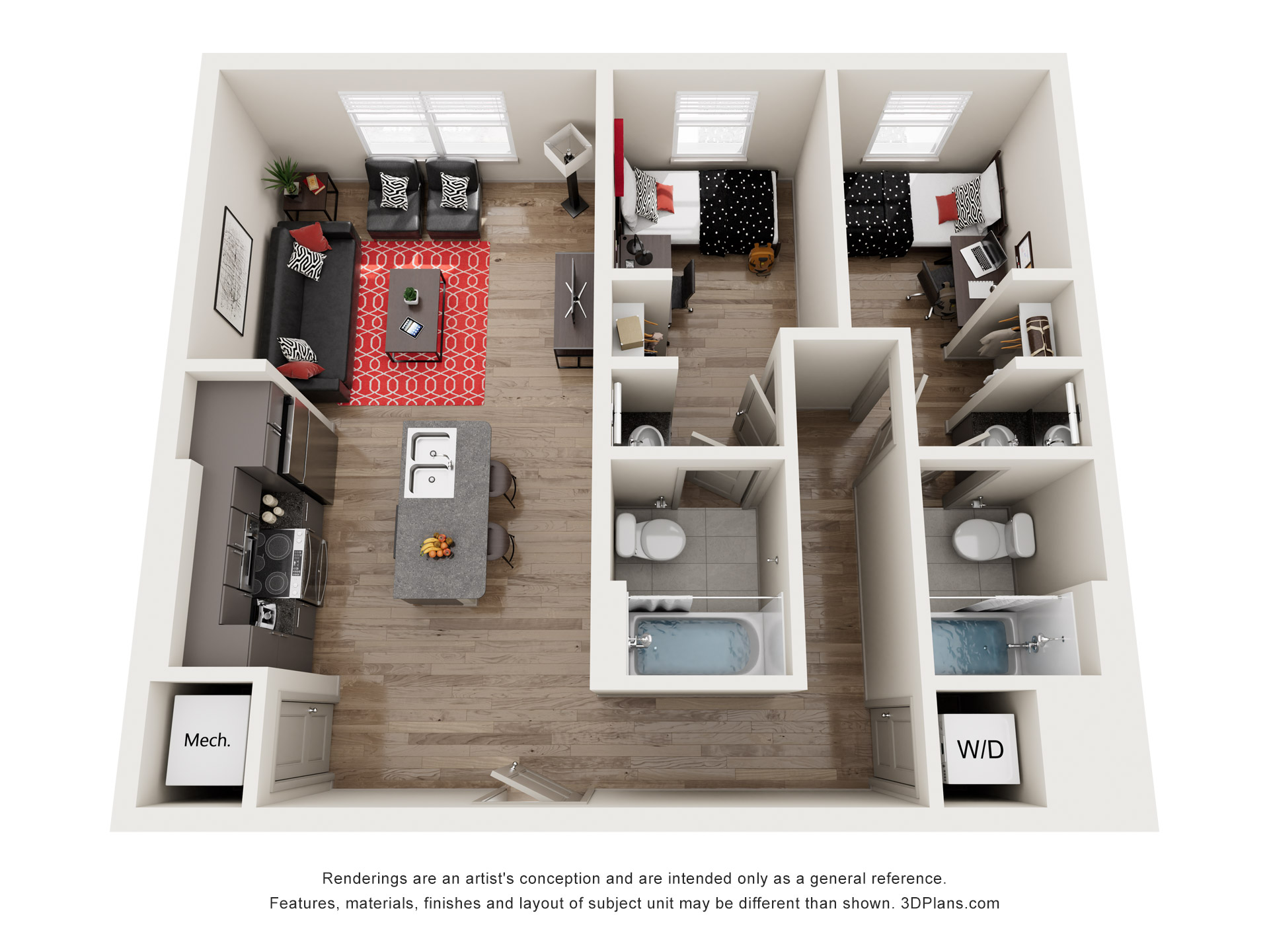 Campus Inn One Bedroom 3D Floor Plan