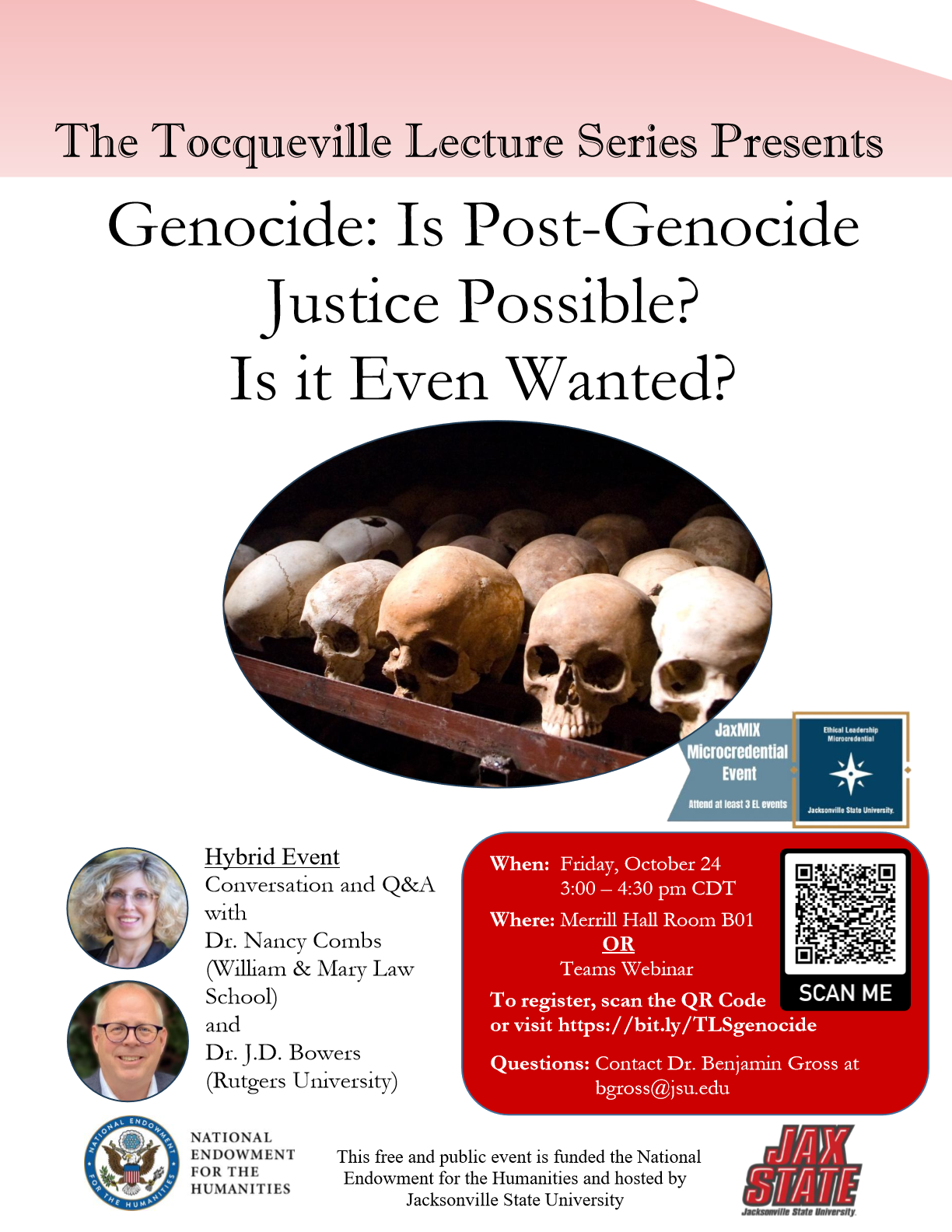 This event is free and open to the public. It is made possible through a grant from the National Endowment for the Humanities. It is hosted by the Tocqueville Lecture Series on the campus of Jacksonville State University. This event is part of the Jax MIX Ethical Leadership microcredential at Jacksonville State University.
